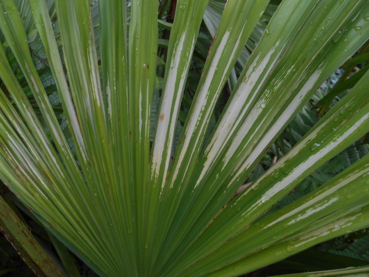 Bij het nieuwe blad van een van de fortunei x wagnerianus hybrides verloopt een witte band over het blad. De pigmentvorming (chlorofyl) is hier blijkbaar afwezig. Doorgaans verbrandt dergelijk bladweefsel in de zon en wordt het bruin maar dat krijgt deze palm nauwelijks. De schade lijkt op (uitgroeiende) vorstschade, maar in recente winters (14/15 en 15/16) heeft het hier nauwelijks gevroren (-5°C). Het voorlaatste blad heeft de schade niet. Bij schade aan de groeipunt en opkomende bladsperen door bevriezing zie je doorgaans een stapsgewijze uitgroei bij opeenvolgende bladeren van binnen naar buiten.