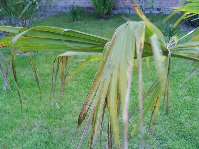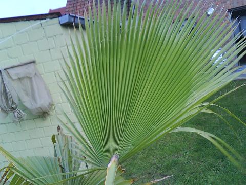Tijd voor een beetje details van de Washingtonia. Ik heb op hetzelfde moment van het aanplanten van de Washingtonia ook deze Trachycarpus ( geen fortunei, maar wat het is weet ik niet ) in de grond gezet en die heeft nu zijn eerste nieuwe blad gevormd. Dit eerste nieuwe blad :| is ook niet wat het zou moeten zijn. Hij vertoont plaatsen waar geen bladgroen is, het blad is gewoon wit. Zie op de detailfotos ter verduidelijking.