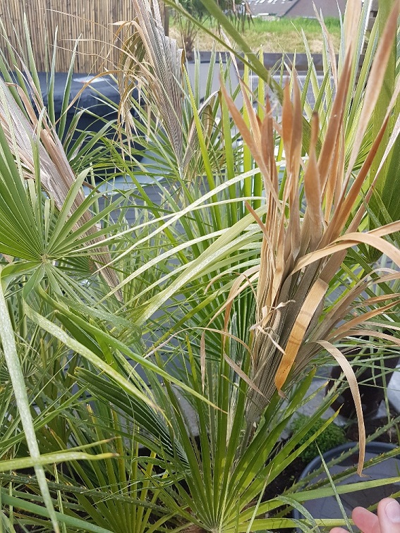 Zowel afgelopen jaar en als dit jaar heb ik 2 Chamaerops humilis aangeplant in de volle grond (tuinaarde met 25% zand). Ze staan beide in de volle zon en krijgen dagelijks bij droog weer een sproeibeurt. Beide exemplaren waren mooi frisgroen bij aanplant, maar de nieuwe speren die gevormd worden lijken in de eerste instantsie mooi groen maar voordat ze complete uitvouwe verdorren ze en worden ze uiteindelijk bruin. Iemand een idee wat hier mee aan de hand zou kunnen zijn?