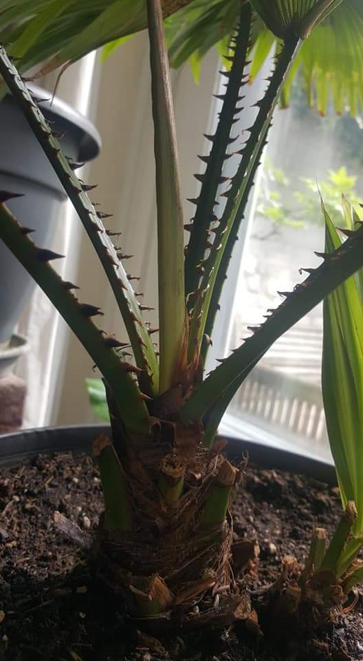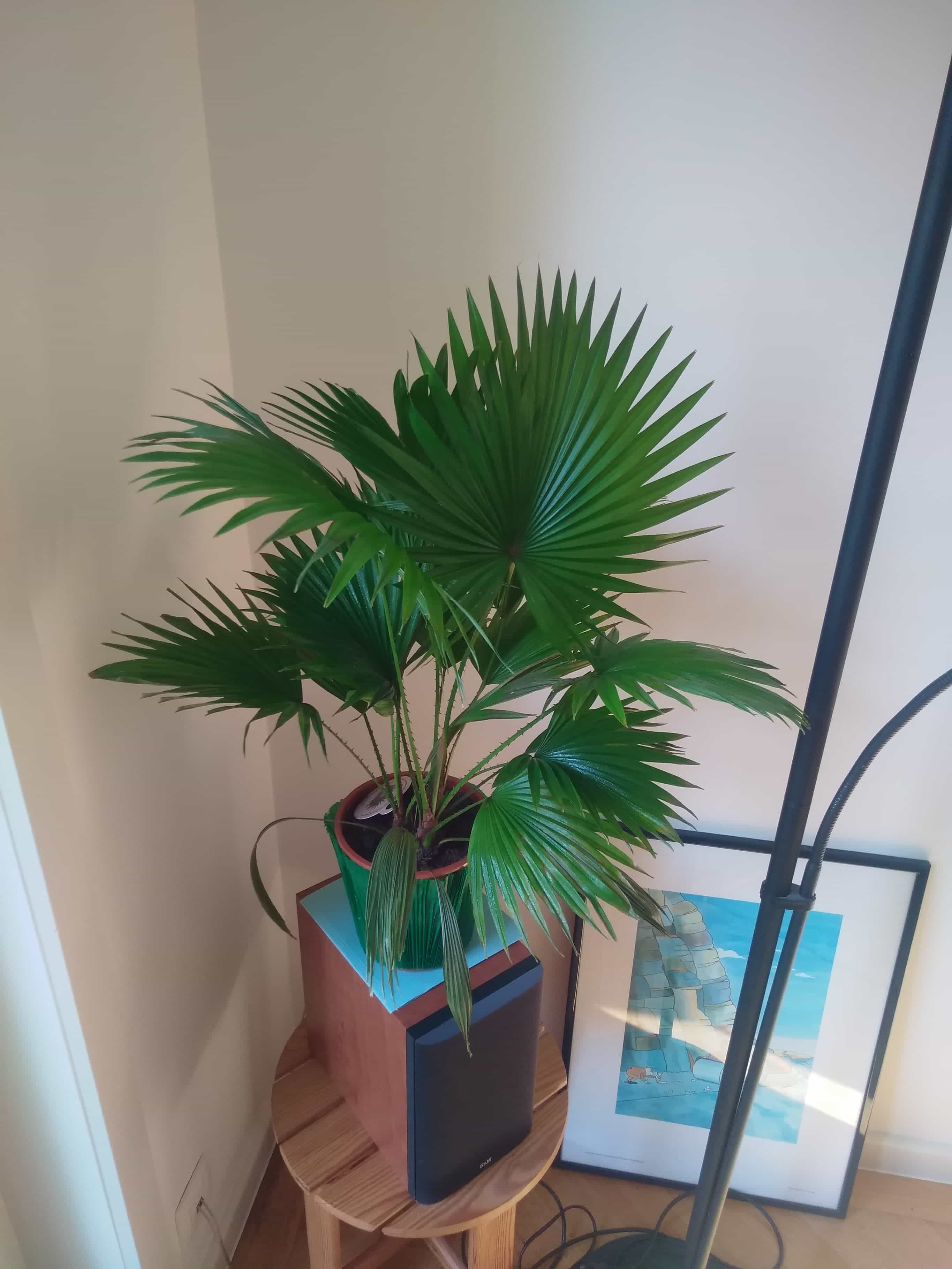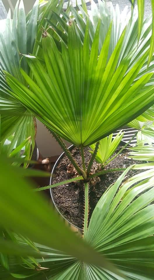 Let wel: dit is wel een zeer notoir voorbeeld van een tropische jongen die het echt heel moeijlijk heeft in onze huisjes. Zelfs Licuala, Nypa en nog wel andere hoogtropicals heb ik hier meerdere jaren OK gehouden (met wat kunst en vliegwerk), en zelfs dat is me bij Saribus rotundifolia (want zo heet ie tegenwoordig!) nog niet gelukt.
