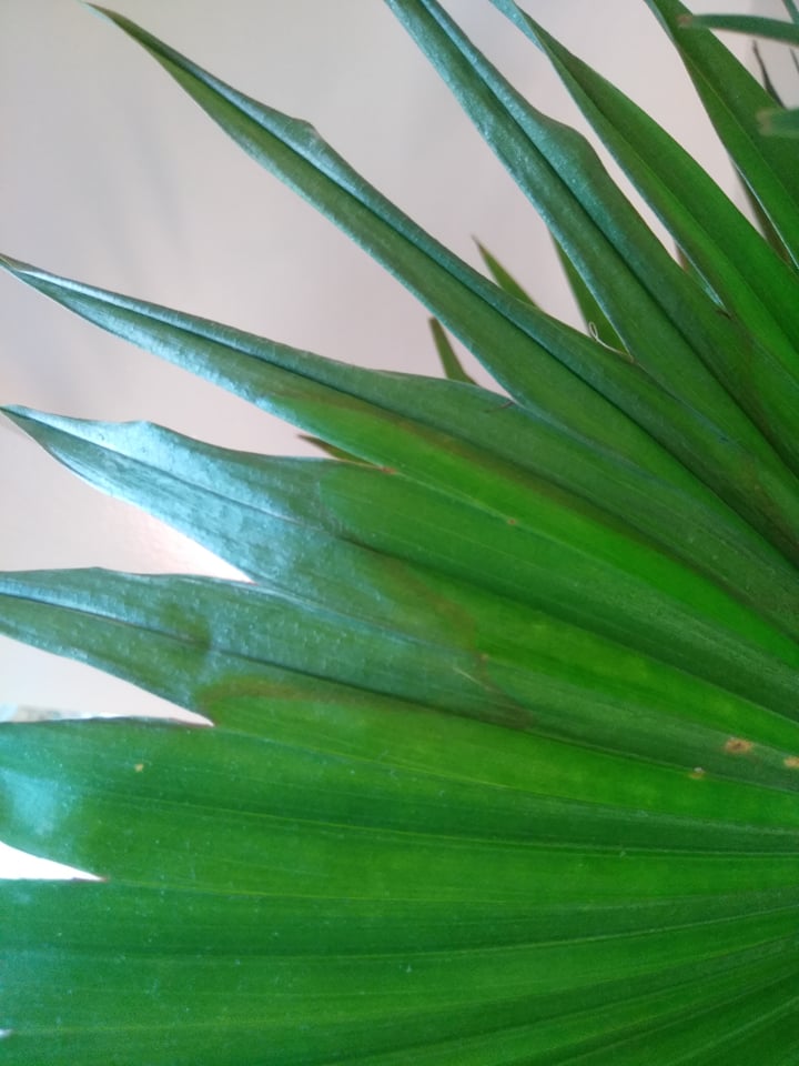 Daar de Livistona Rotundifolia een vrij dorstige plant is die een hoge luchtvochtigheid prefereert leek mij dit wel gepast. Iemand enig idee wat dit is/hoe te genezen? Anders ziet de plant er gezond uit denk ik. Weinig droge plekken, speer groeit volgens mij. (Er hangen wel wat bruine vezels aan de speer... Kan geen kwaad denk ik?).