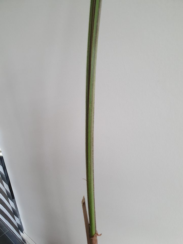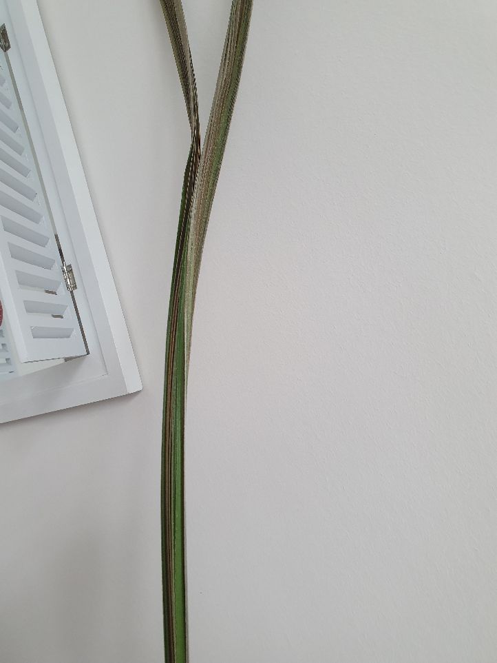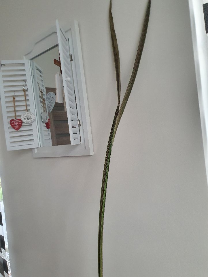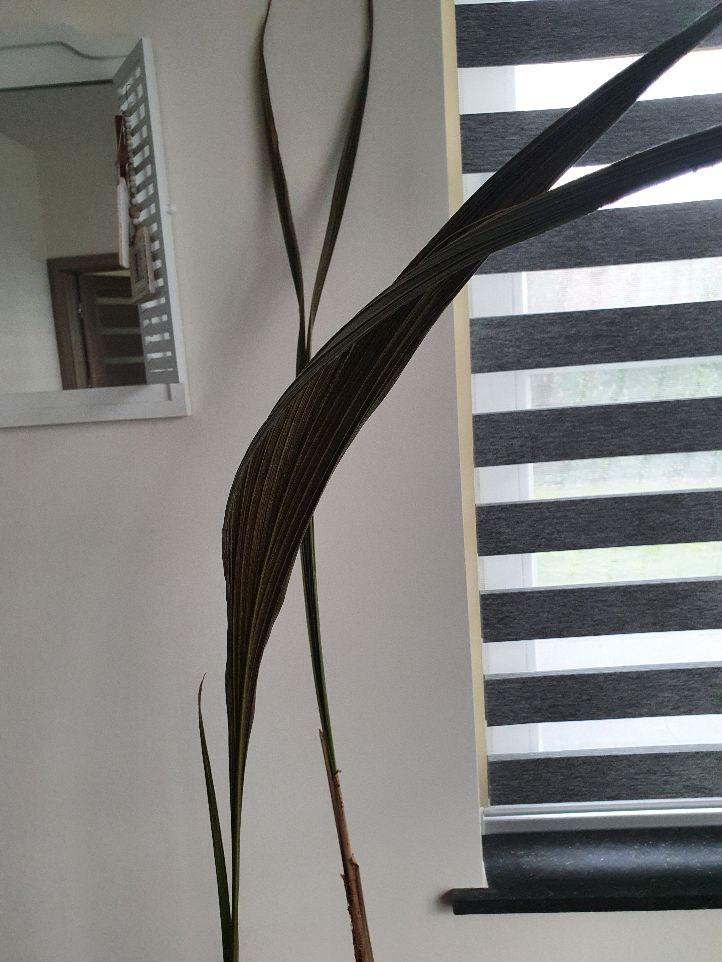 Toen de palm in de huiskamer stond, t/m september groeide hij goed, maar daarna gaat automatisch de vloerverwarming aan en toen zag ik dat het blad droog begon te worden. Had geneveld, dacht dat het te droog was. Het ging slechter en had het naar de 18 graad kamer gezet, had toch nog hoop. Maar goed, dan heb ik pech, jammer.