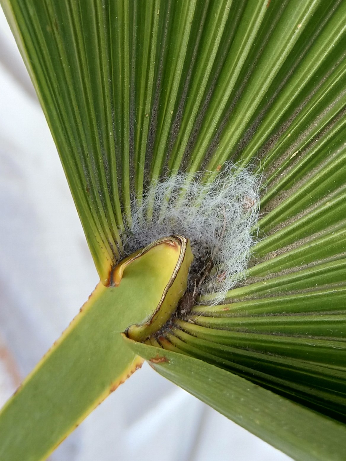 Ik heb sinds vorig jaar augustus buiten 2 Wagner palmen in pot. Tijdens de vorst zijn ze ingepakt geweest in fleecedoek. De stam en de bladeren zien er nog goed uit. Echter zie ik in de bladoksels witte pluizen. Zie foto's. Iemand enig idee wat het is? En zo ja, wat ik er tegen kan doen?