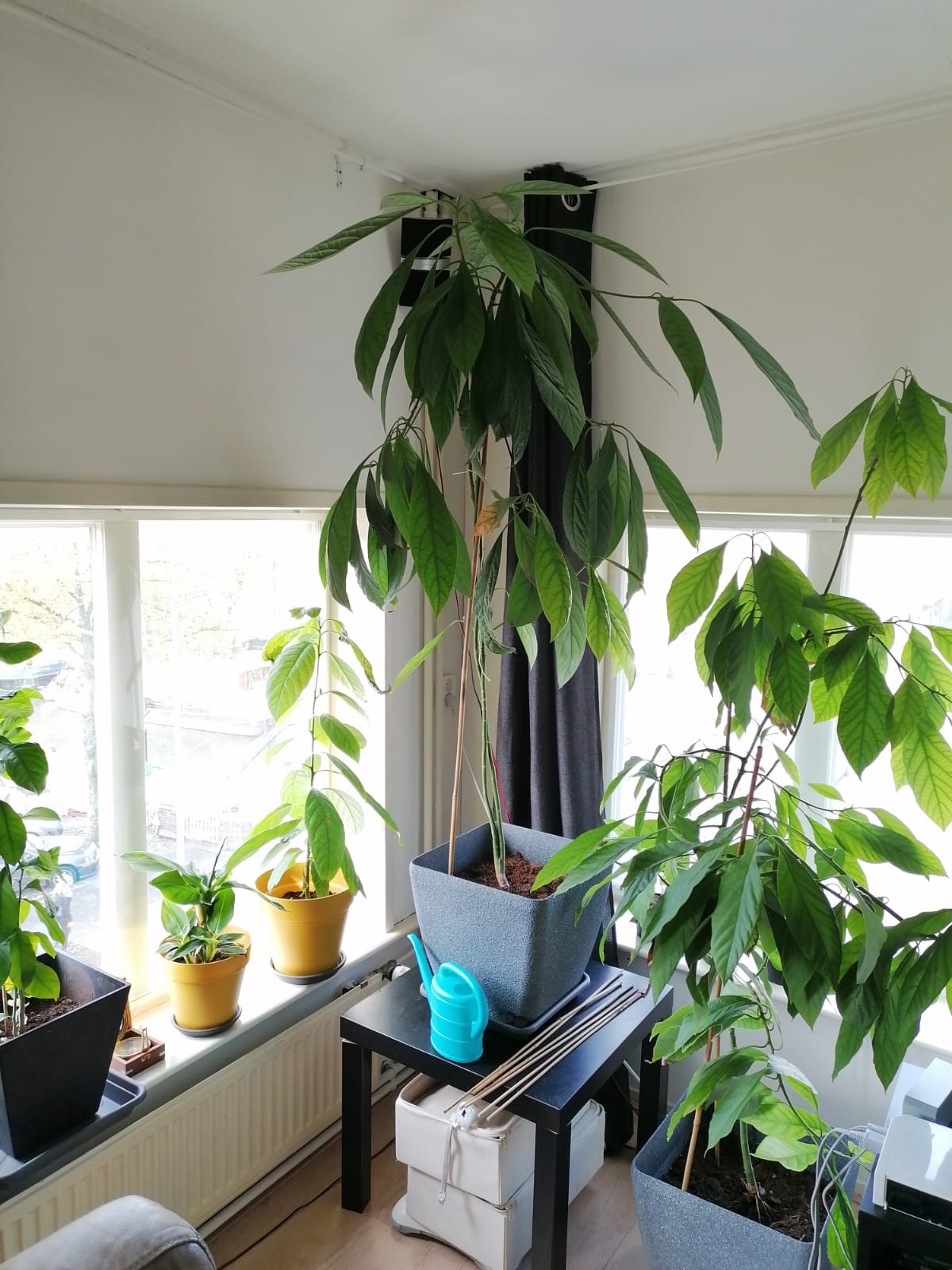 Mijn avocadoplant (+/- 5jr) vertoont sinds kort donkere plekken zoals op de foto te zien is. Twee zijtakken en een klein stukje van de hoofdstam heeft hier last van. De plant groeit voor de rest zonder problemen en de bladeren hebben ook geen bruine punten of brandplekken. Foto 1 is een closeup van de linker (grote) avocadoplant die te zien is op foto 2. Wat kan het zijn en moet ik actie ondernemen?