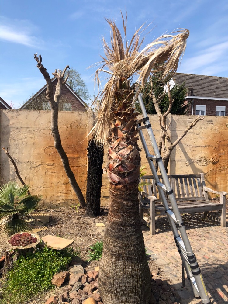 Omdat deze jonge een beetje te groot is voor helemaal in te pakken, heb ik al het blad verwijderd voorde vorst. Vervolgens de speer ingepakt met vlieddoek en voorzien van warmtekabel.