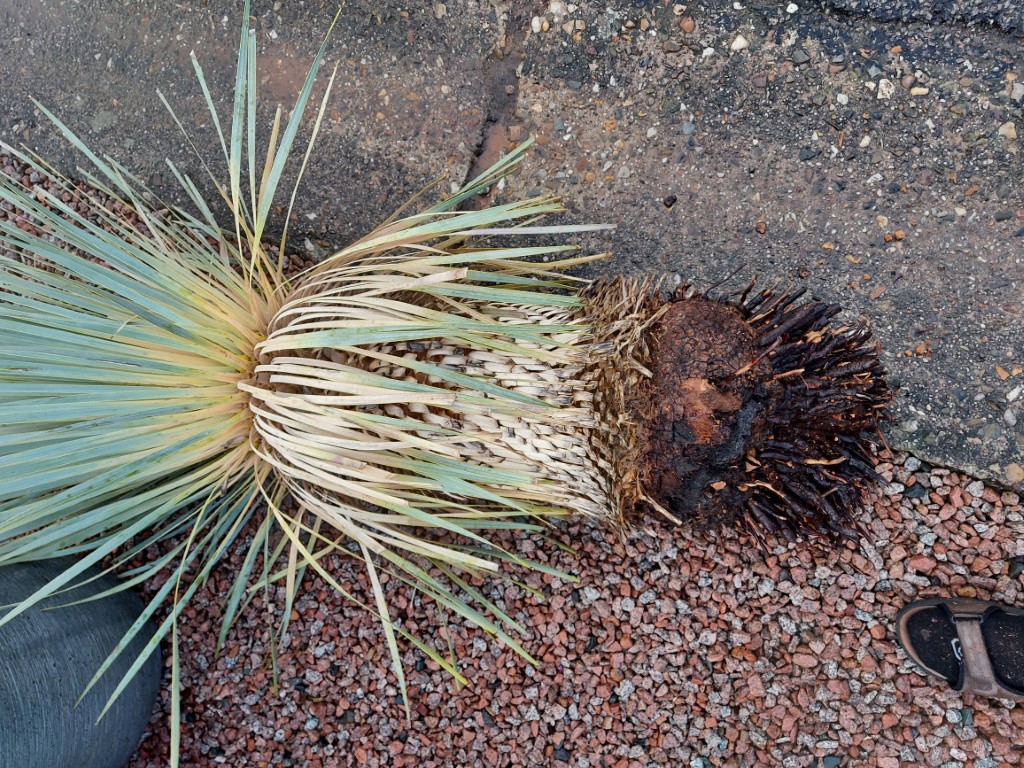 Daarna geen of weinig water geven maar misschien wel de kroon af toe nevelen. Dat het blad wordt afgestoten is nu onvermijdelijk. Als de beworteling slaagt is een intacte speer voldoende voor de hergroei. Hopelijk loopt het dan nog goed af met deze onfortuinlijke aankoop.