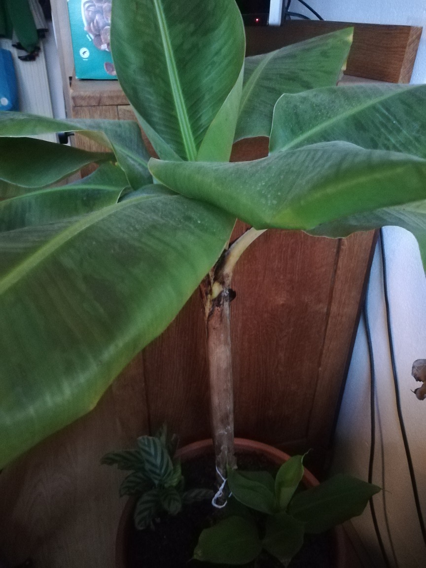 Sinds 4,5 jaar heb ik deze mooie bananenplant in huis. Heeft zelfs een verhuizing overleefd. Alle donkere stookwinters goed overleefd. Nu kreeg ik dit najaar het idee om hem 'af te pellen'. Voornamelijk waren het uitgedroogde bladstengels, maar ook een paar halfrotte natte stelen eraf gehaald tot het 'vitale gedeelte'. Aan de onderkant ondekte ik een soort basisgedeelte en heb daar niks aan gedaan. Een paar weken terug heb ik hem een mooie nieuwe grote pot gegeven. Toen kreeg hij ineens voor het eerst zijscheuten. Heel leuk! So far so good.