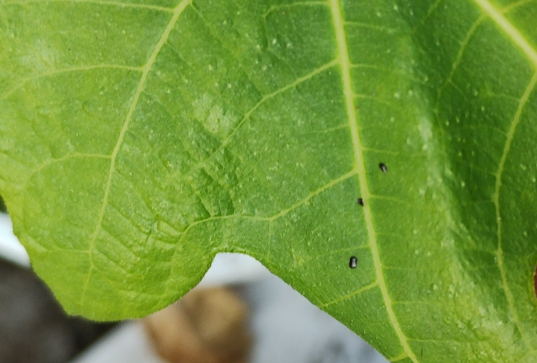 Ik heb in de kas regelmatig last van zwarte glimmende vlekjes, alsof iets dit achter laat op het blad, wat opvalt is dat er op de plek van de vlekjes vaak een bromvlieg zit, zou deze dit achter kunnen laten?