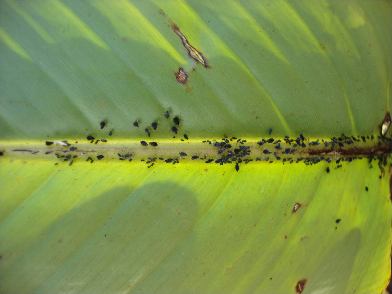 mijn musa basjoo heeft aan de onderkant van de bladeren en bij het stuk stam waar nog bladeren aan zitten allemaal beestjes zitten.