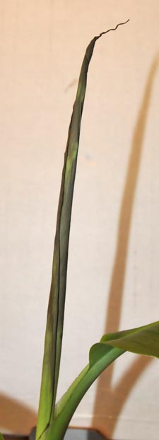We zijn nu ongeveer een maand verder en omdat er geen nieuw blad meer tot ontwikkeling kwam heb ik als drastische maatregel de stengel op een paar cm. van de bodem doorgesneden.