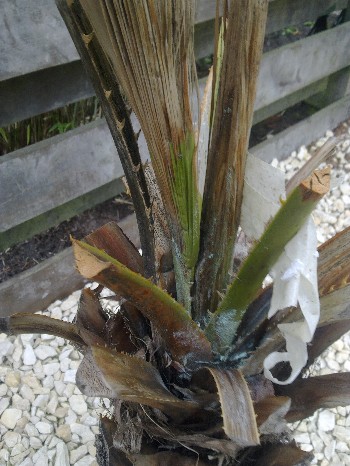 hier mijn robusta na de winter. ik heb hem al een tijdje uitgepakt en ik dacht dat hij ging groeien maar nog steeds niks. hij is nog een heel klein beetje groen maar de speer word steeds bruiner.