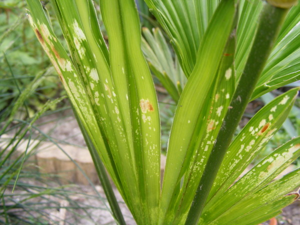 Mijn trachycarpus wagnerianus heb ik eind april de grond geplant, slaat goed aan met 2e nieuwe bladeren als gevolg. Vanmiddag kwam ik dit blad tegen maar vraag mij toch af wat het is? Ik denk zelf aan een beestje maar heb die niet kunnen ontdekken.