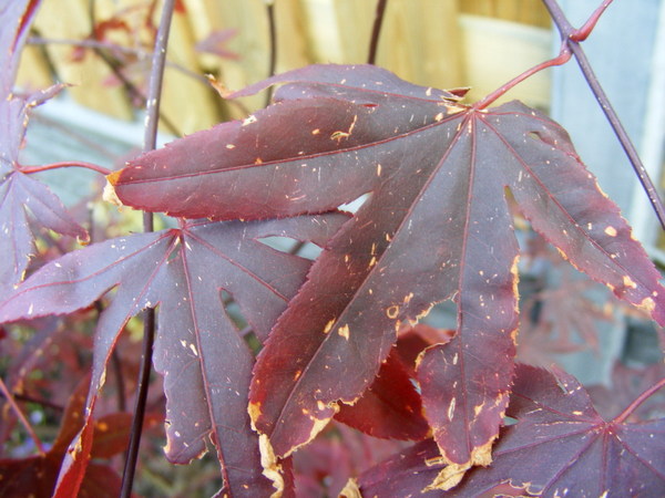 dat is schade van de wind, heb hier ook acer staan en had het vorig jaar ook , nu staat deze er mooi bij.