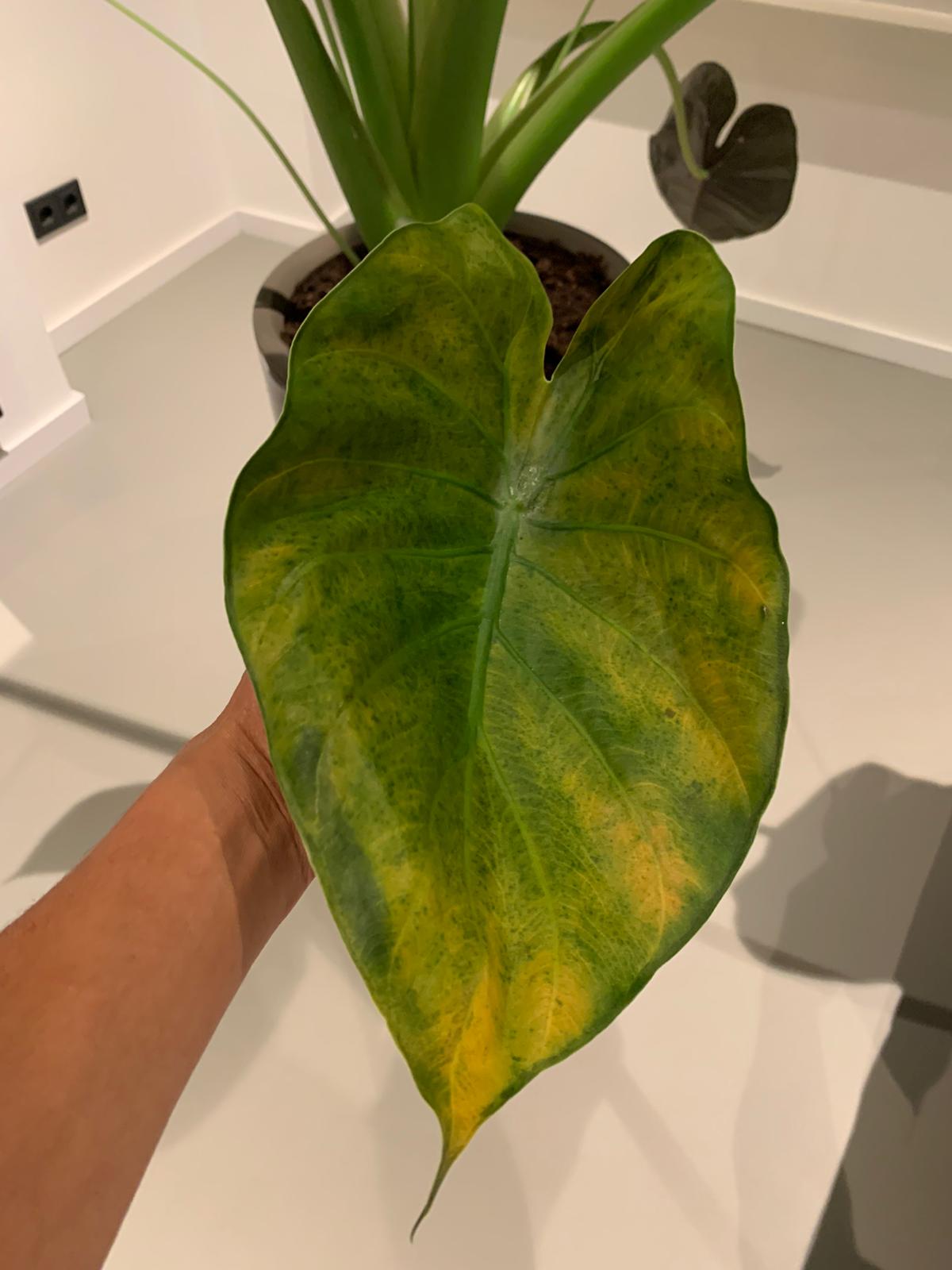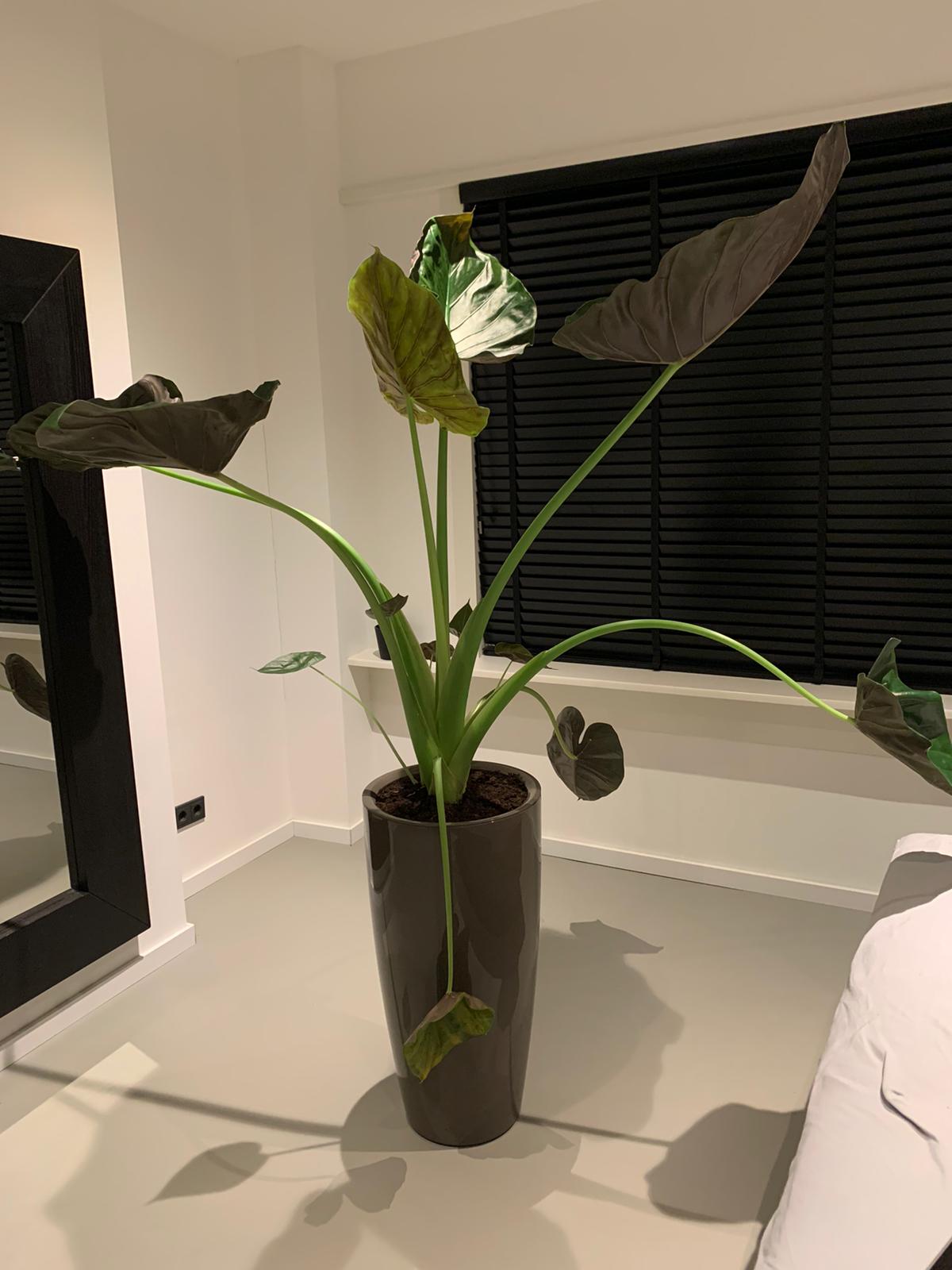 Hi! Wij hebben nu ongeveer 5 maanden een Alocasia Portadora staan. Het hoogste blad is +/- 1.70m hoog. Er zijn tot nu toe al 6 bladeren afgestorven, deze snijden we dan aan de onderkant af. Vaak gebeurt dit als er een nieuw blad in aantocht is, maar we hebben ondertussen al wel meer bladeren afgesneden dan dat er nieuwe bij zijn gekomen. We komen er maar niet uit of we nou teveel of te weinig water geven, of dat er een andere reden is dat er al zoveel bladeren zijn afgestorven. Wat er dus gebeurt wanneer er een blad "afsterft" is dat deze begint te hangen en uiteindelijk op de grond hangt waardoor deze knakt. Bladeren verkleuren echter niet geel of bruin.