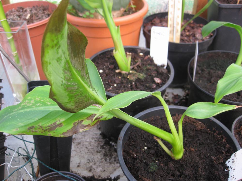 Een paar dagen terug zag ik op één ensete perrieri zaailing die binnen stond kleine puntjes op de onderkant van het blad ,
