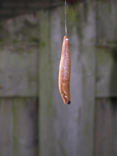 Dit verschijnsel is nieuw voor mij. Vanmorgen bungelden meerdere naaktslakken aan een slijmdraad onderaan de takken van de boom waaraan ze zich eerst tegoed deden. Om bij de jonge loten van deze Sophora japonica pendulum te geraken moesten ze daarvoor 3 m omhoog kruipen en vervolgens weer omlaag. De slijmdraad dient kennelijk voor een snelle (nood)afdaling. Ik vind het fascinerend dat een slak met een simpel 'brein' kennelijk de draai kan maken van dezelfde (lange) weg terug en dit snellere 'abseilen'. Pech dat de slijmdraad bij de afdaling opdroogt, waardoor de slak halverwege blijft bungelen.