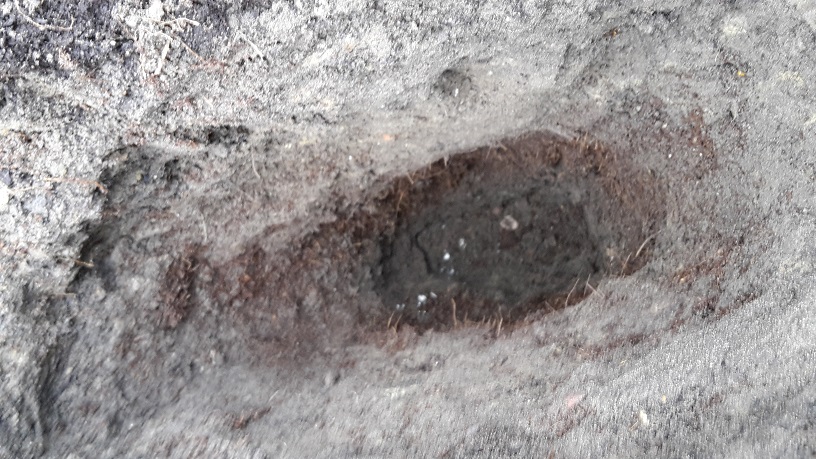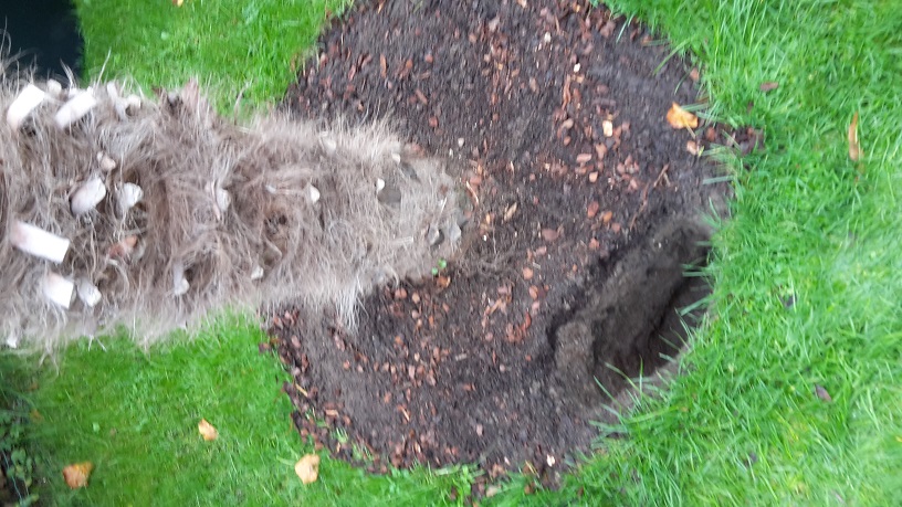 update, ik heb vandaag een kuil aan de rand van het plantgat gegraven even diep als toen ik de trahy. geplant heb dichter durfde ik niet te komen om eventuele wortelschade te voorkomen zoals je kan zien op de afbeeldingen is de grond goed vochtig onderaan geen stilstaand water als ik in de tuingrond knijp kleef die wel samen, maar van zodra ik deze door mijn vingers rol komt die wel los is dit de oorzaak ?