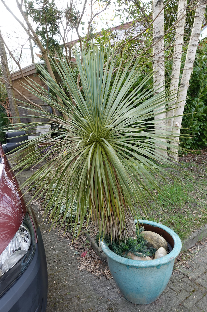 Dennis, Yucca rostrata kan prima als kuipplant worden gehouden. Volgens de beschrijvingen volstaat een bescheiden kuipmaat omdat het wortelstelsel zich makkelijk aanpast. De afgebeelde plant staat al jaren in dezelfde kuip op deze plek en heeft de afgelopen winter aan weer en wind blootgestaan. Het exemplaar in de tuin heeft voorafgaand aan het uitplanten als kuipplant enkele nachten met -19°C doorstaan met alleen bubbelfolie om de kuip. De Yucca gaf geen krimp terwijl verschillende Trachy's het loodje legden. Het was niet mijn opzet maar de temperatuur daalde van de een op de andere nacht van -10 naar -19°C boven de versgevallen sneeuw. De nachten daarop werd het nog een paar graden kouder maar toen had ik de Yucca voor de zekerheid in de kas gezet.