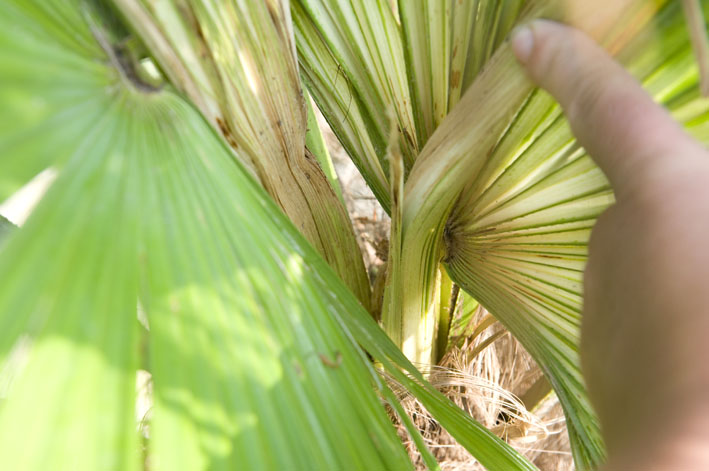 hier leken de palmen snel te herstellen van de speerrot maar achteraf bleek dat het niet echt rot was. een deel van de speer was weggerot slechts zodoende komt nu de andere helft van het blad omhoog en groeit het vrolijk verder.