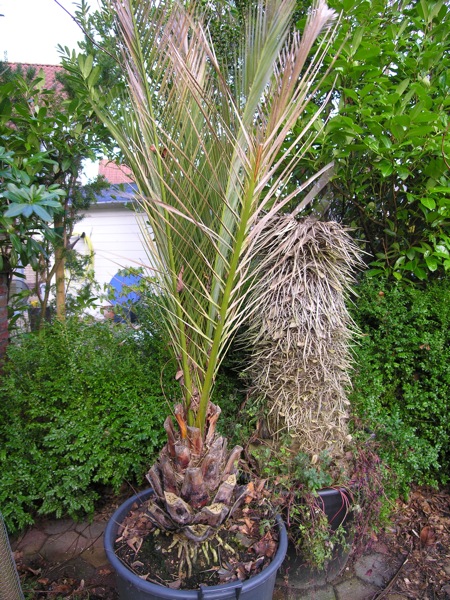 Een grote Chamaerops is ondertussen dringend toe aan de grote kuip van de Phoenix.