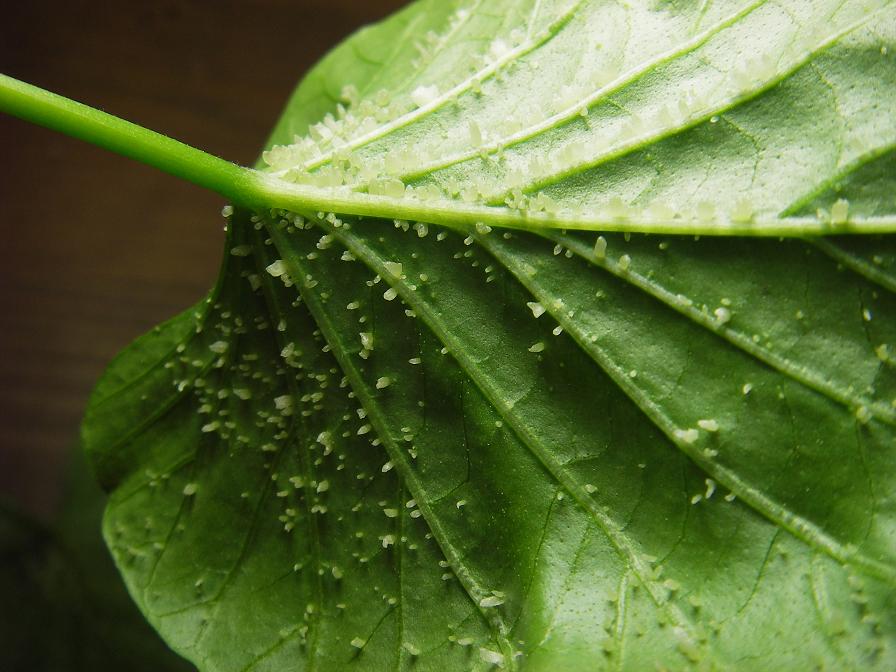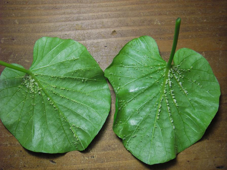 Aan de onderkant van de wat grotere bladeren van mijn Stictocardia Beraviensis vormen zich minuscule kleine uitstulpingen. Het blad ziet er verder gezond uit en groeit goed.