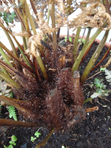 Het blad is grotendeels verdroogd, her en der zit nog wel wat groens. De bladstelen en de beginnende stam hebben nog al hun haren en zien er nog goed uit. Toen ik er daarnet langsliep bekeek ik 'm eens van wat dichterbij om te kijken of er nieuwe rollen te zien waren...