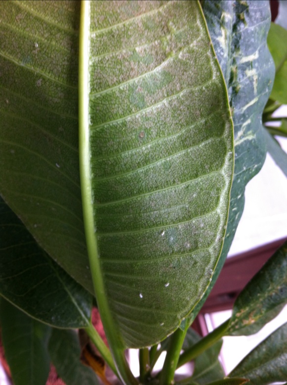 Ik heb twee dwergplumeria's. Met de ene gaat alles goed en die geeft reeds bloemen. Met de andere gaat het slecht. De bladeren vertonen vlekken, ik heb er witte vliegjes op gezien en als ik de plant goed afspoel met water, kleurt het water groen. Enig idee wat dit kan zijn en hoe ik de plant het best verder behandel?