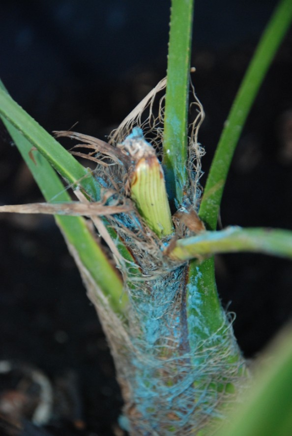 Zojuist eens een kijkje gaan nemen bij enkele Trachycarpus Fortunei waarvan er 2 speerrot hebben,kon de speer er zo uit trekken,bij de ene (Trachy 1) zat er wel een nieuwe speer klaar en deze zat nog vast,bij Trachy 2 is het 1 hapend gat,nochtans hebben ze heel de winter binnen gestaan in de kelder waar het rond de 11 graden is,heb ze nu behandeld met bordolaise pap en hopend dat ze toch nog herstellen.Waren de eerste waar ik mee gestart was over 3,5 jaar,jammer ....