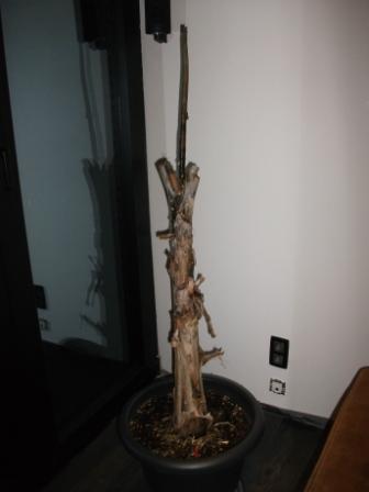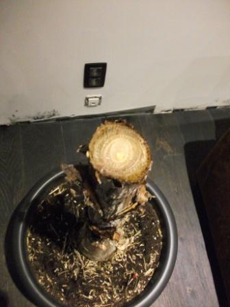 Nu ziet hij er niet zo geweldig uit... bovenaan ziet hij zwart en met raar vocht eraan. De stam zelf voelt wel nog stevig aan. Ik weet wel dat hij er niet zo super uit moet zien na zo een barre periode maar zo...