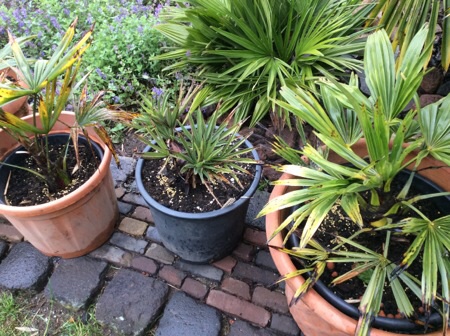 Kan het zijn dat er water onderin je buitenpot blijft staan? Ik zou palmen niet op die manier in een pot zetten, maar in een enkele pot waar het water bij regenval uit kan lopen. Palmen zijn nogal gevoelig voor natte voeten.