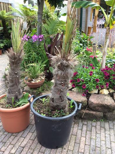 De klei is er tussen uitgespoten, opgepot in niet al te grote potten en dubbele dosis palmbooster gegeven.