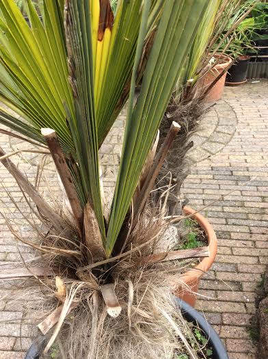 Bij plaatselijke bouwmarkt staan er al 2 jaar paar palmen waar de helft inmiddels al lang dood is, bekend probleem. 2 vermoedelijke trachycarpussen wagnerianus leven nog. Beide palmen hebben speren klaar staan. De kweker waar ze vandaan komen zou ze ophalen alleen deze bestaat niet meer, hij moest ze tot begin juli vast houden. Nou heeft mij vader gezegd tegen de eigenaar dat ik er interesse in had en mocht ze voor een 10 p.s overnemen en zo ben je 2 palmen rijker.