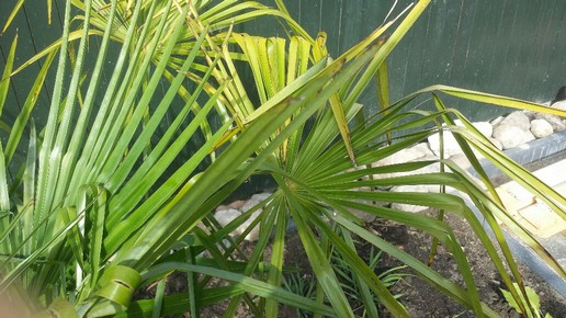 Is de Trachycarpus pas aangeplant, houdt dan rekening met een extra waterbehoefte van de palm zolang deze nog geen nieuwe wortels heeft gevormd. Het afstoten van oud blad is dan een aanpassing. Helemaal te vermijden is het niet, zeker nu het warmer wordt en de verdamping toeneemt. Eventueel kun je de palm wat schaduw geven zodat de bladverdamping wordt beperkt. Trachycarpus hoeft niet per se in de volle zon te staan, integendeel deze palm doet het prima in de schaduw. Zolang hij goed groeit en de vergeling alleen de oudste bladeren betreft, is er geen redenen om je hier zorgen over te maken. Ik zie naast de palm een waterpoel, maar neem aan dat het een folievijver is.