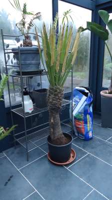 Vandaag is de plant aangekomen. Was een aangename verassing want ofwel heeft de verkoper in zijn advertentie enkel de stammaat opgegeven zonder de kruin ofwel heb ik iemand anders zijn Yucca carnerosana toegekregen :lol: . In ieder geval is de Yucca veel groter dan wat ik dacht besteld te hebben. Morgen zet ik hem in kuip want heb momenteel geen potgrond in huis. Als ik de aarde bekijk die nog een beetje aan de onderzijde van de stam hangt lijkt dit wel stekgrond te zijn. Zou dit beter zijn om de Yucca daarin op te potten of toch beter gewone onbemeste potaarde gaan halen zoals ik normaal doe?