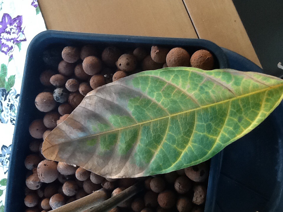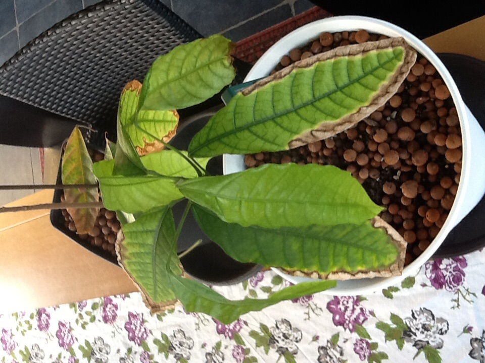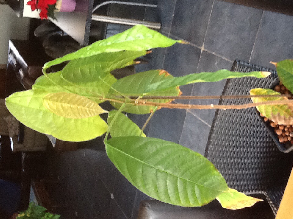 Mijn cacaoboompjes hebben geringe tijd last van een verkleuren blad die naar verloop van tijd afvalt. Voornamelijk de onderste exemplaren hebben er last van. Het probleem begint met het lichtbruin kleuren van het bladpunt en trekt zo langs de zijkanten omhoog met een gele rand. Ook zijn er necrotische vlekken te zien. Mijn ene boom heeft er beduidend meer last van dan de andere.