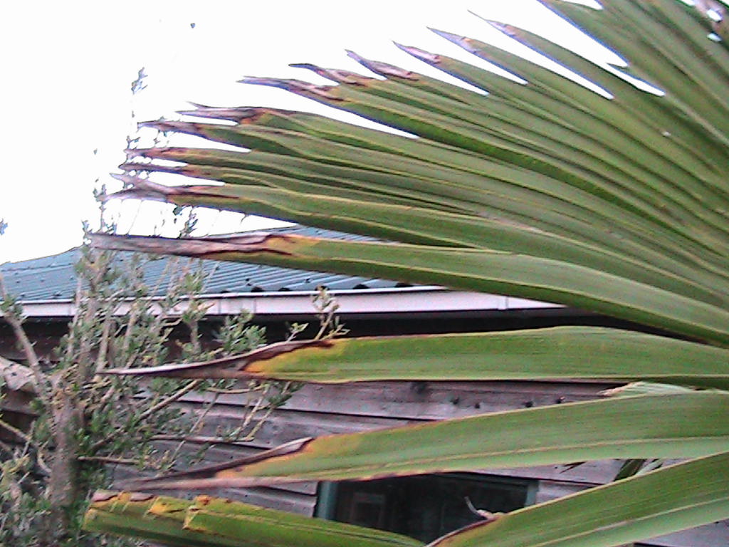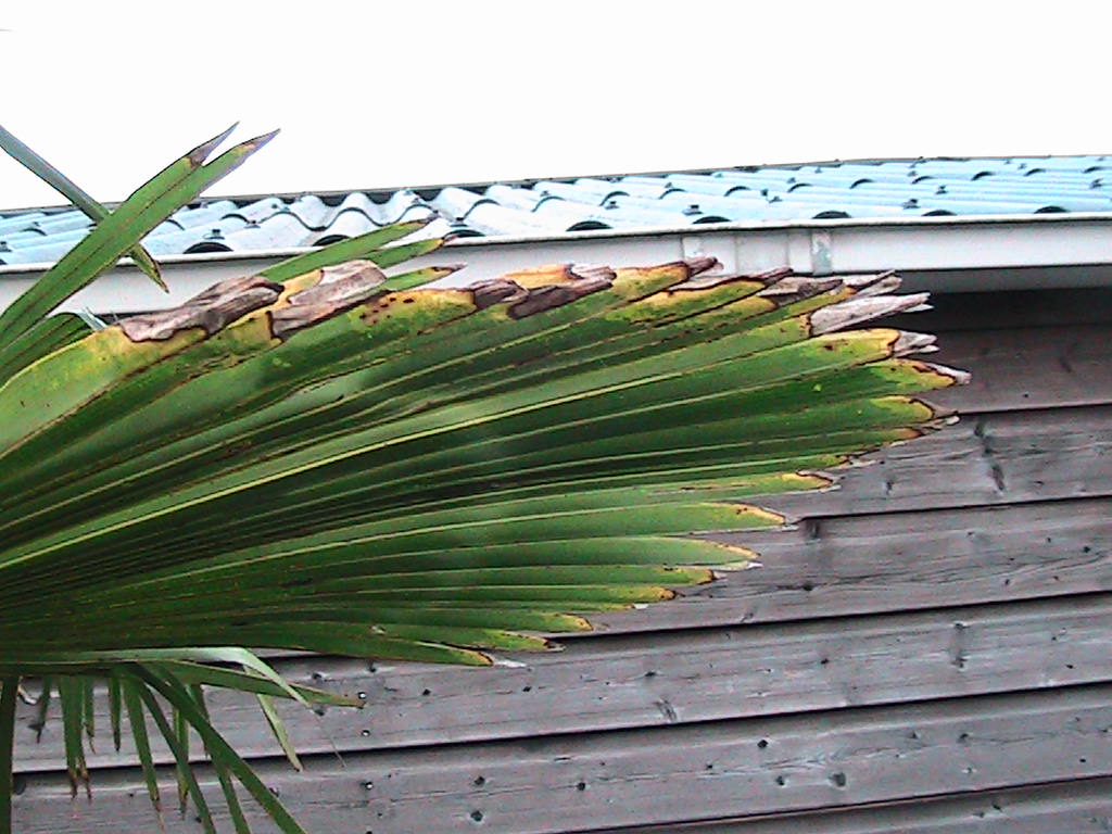Van mijn Trachycarpus Wagnerianus zijn de bladpunten geel staat in eeen grote pot 180 liter de nieuwe bladeren hebben het niet voedingebrek of wat anders of het hoort gewoon zo.