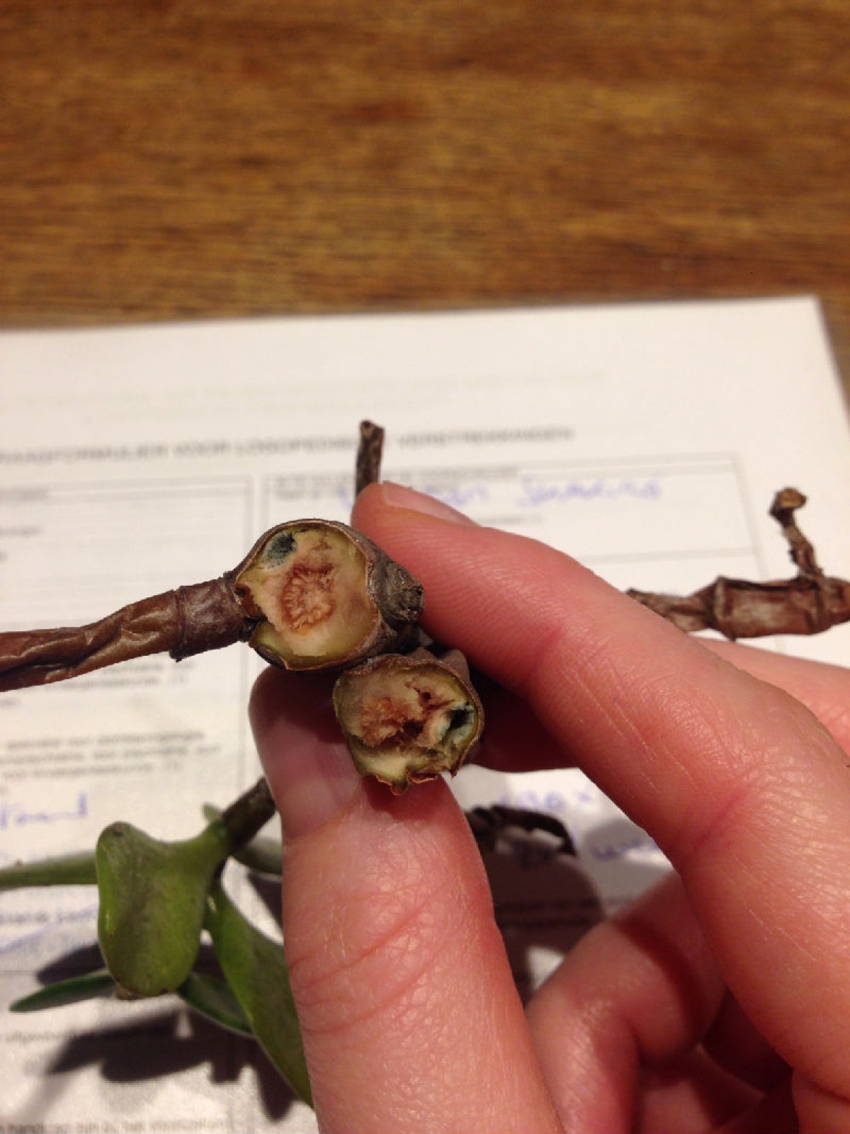 Als ik de zieke takken afbreek zijn de takken plat en is er regelmatig schimmel, ofwel zijn ze al helemaal droog en leeg vanbinnen.
