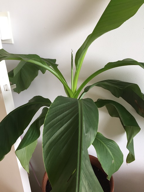 In het begin stond de banaan voor het raam (zuid-west) en daardoor kregen de bladeren bruine vlekken. Daarna verplaatst naar deze plek en de plant staat hier vanaf midden april.