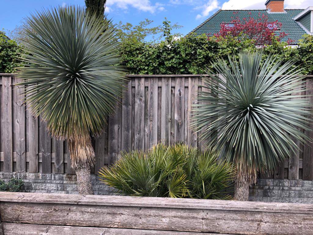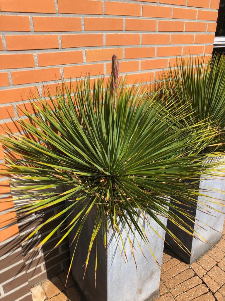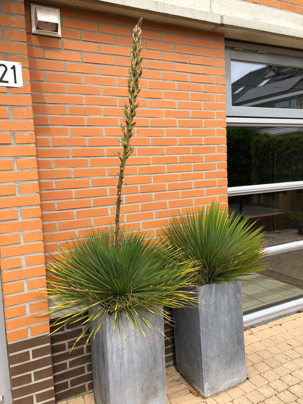 De Yucca ontbeert weliswaar nog een stam maar is blijkbaar al bloeirijp. Naarmate er een stam wordt gevormd zal de kruin ook niet veel groter worden. Misschien krijgen jonge exemplaren vanwege de geringe planthoogte extra lange bloeiwijzen. Bij Agave is een hoge bloeiwijze normaal. Alleen sterft daarbij een Agave na de bloei af. Toen destijds hier Yucca thompsoniana bloeide bleef de bloeiwijze korter maar die plant had al een stam van 1 m. Jou plant heeft het in ieder geval duidelijk naar de zin.