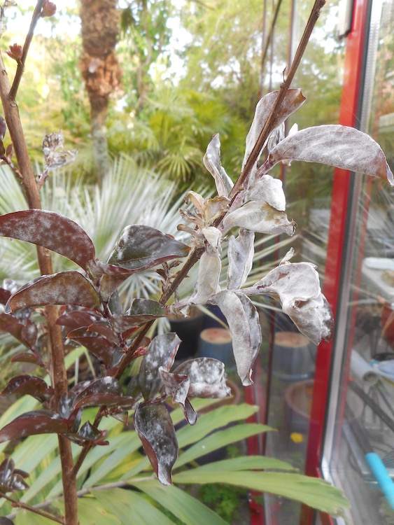 De plant is in het najaar verpot en staat al een maand buiten op een zonnige plek. Mijn vorige Lagerstroemia stond jaren in de tuin tot de vorst van 2012 het einde betekende. Meeldauw is mij welbekend, o.a. bij eiken zie je het vaak in het St. Jan's lot omstreeks begin juni. De bedoeling was om dit exemplaar als kuipplant te houden omdat in de tuin geen plek meer voor is. Meeldauw verwacht je toch bij vochtig warm weer, niet bij het huidige weertype.