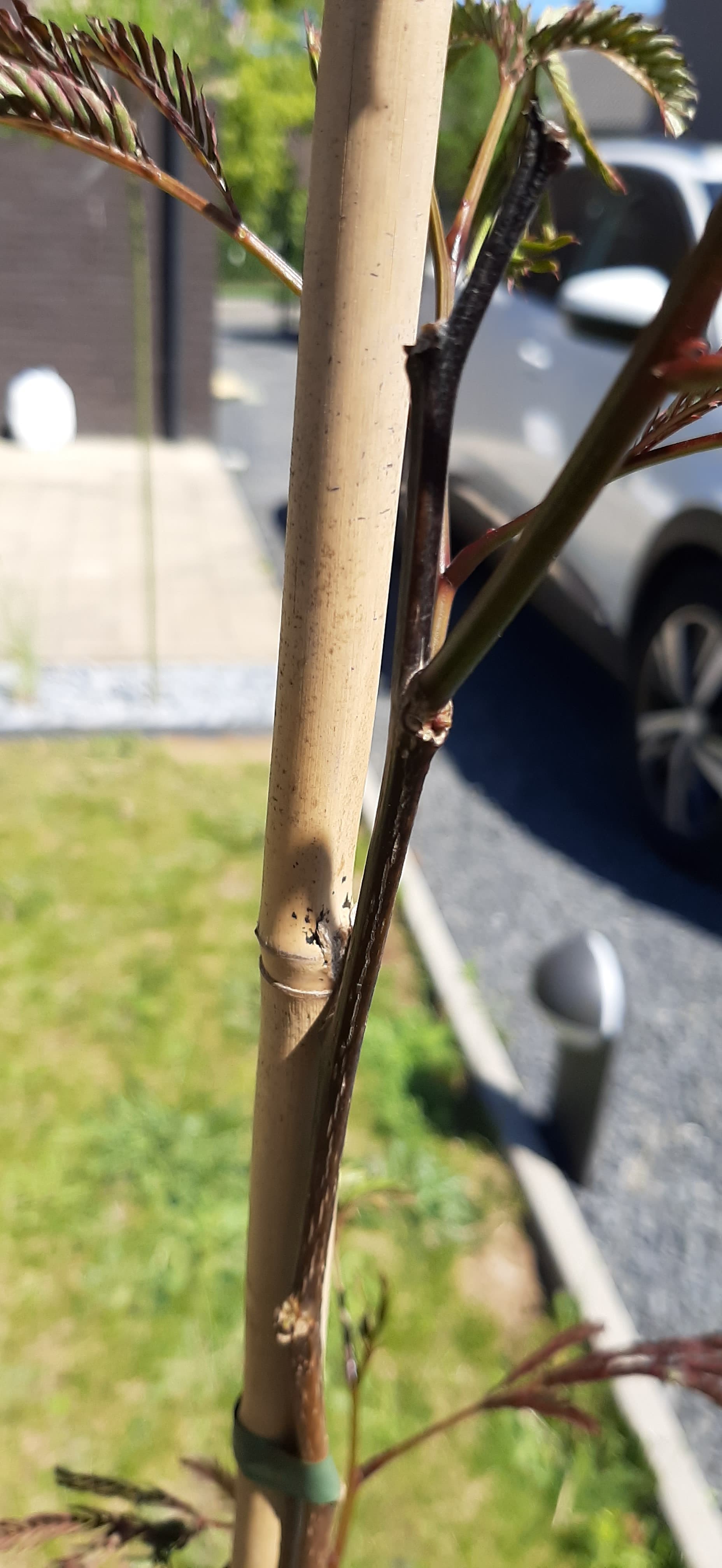 Een zwarte stam herken ik niet tenzij het hout is afgestorven. Het jonge hout is donkerder van tint dan bij de gewone julibrissin. Summer Chocolate afkomstig uit de kas ervaart nog hinder van de IJsheiligen maar is al iets verder dan de de Evi's Purple en Pride in de tuin