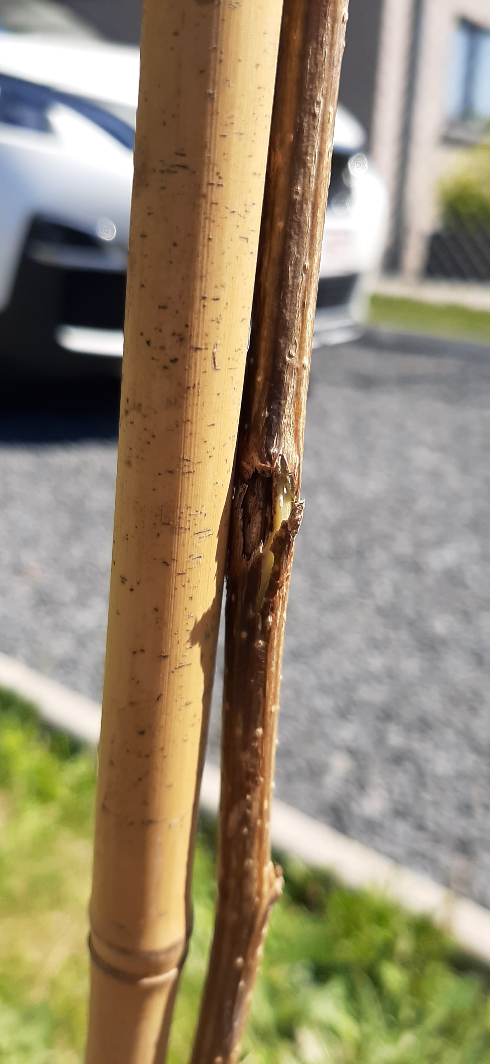 Die stam beschadiging is veel erger! Het ziet er niet goed uit, ondanks dat de plant gewoon doorgroeit erboven op.