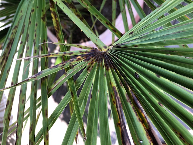 Zitten de spots op alle bladeren of alleen op de oudste. Het is niet ongewoon dat oud blad aftakelt in het groeiseizoen. Het kroonvolume met vitale bladeren blijft doorgaans vrij constant. Die bruine vlekken kunnen geen kwaad en zijn alleen ontsierend. Als de palm voldoende gezonde bladeren heeft, kun je desgewenst de lelijke exemplaren afknippen.