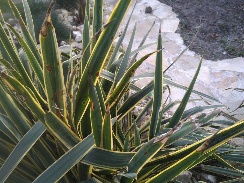 In mijn rotstuintje heb ik 2 bonte Yucca's Filamentosa staan. Ze zijn flink bossig geworden en bieden samen met de de rotsen daardoor enorm goede schuilplekken voor die beesten. Wat je op de foto en schade ziet komt door huisjesslakken. Ze zitten er met tientallen per plant in. Ook heel erg veel ukkies. Voordat de rotsen er waren, hadden ze er al last van. Nu zitten ze denk ik opgesloten want gaan huisjesslakken over zulke hoekige rotsen heen?