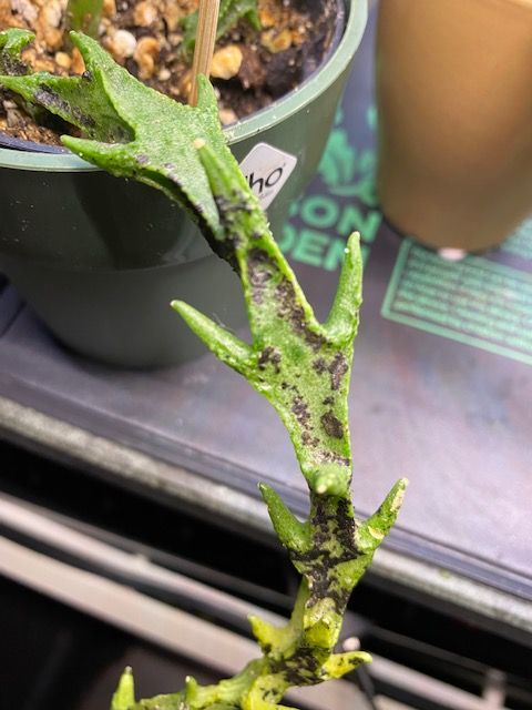 Bij thuiskomst zag ik dat de stengels van deze plant helemaal onder de zwarte vlekken zit. Weet iemand wat dit is?