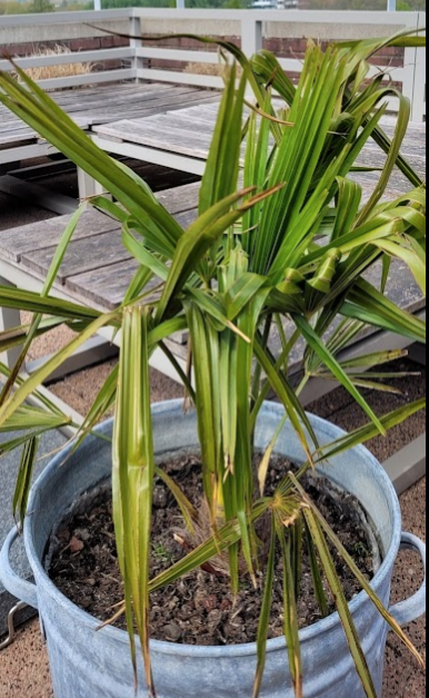 Probeer anders een binnenpot in die zinken containers. Afwatering is essentieel bij palmen in containers, en zeker op balkons, dakterrassen etc.