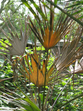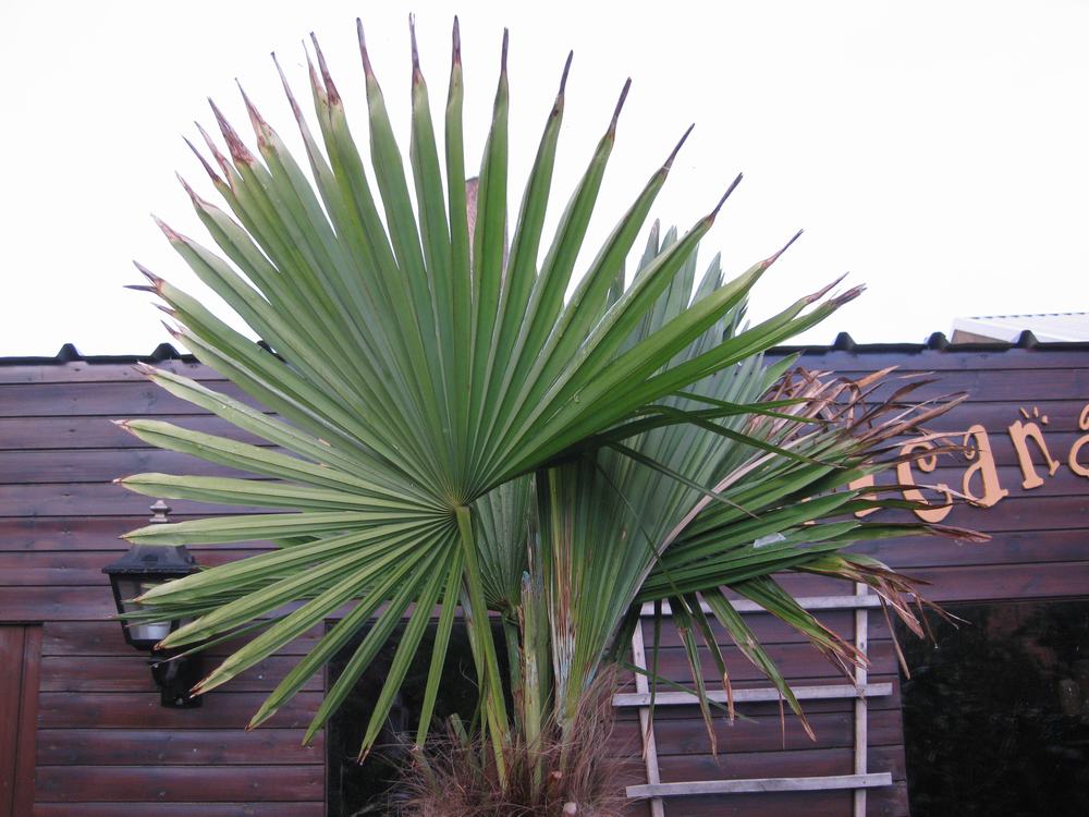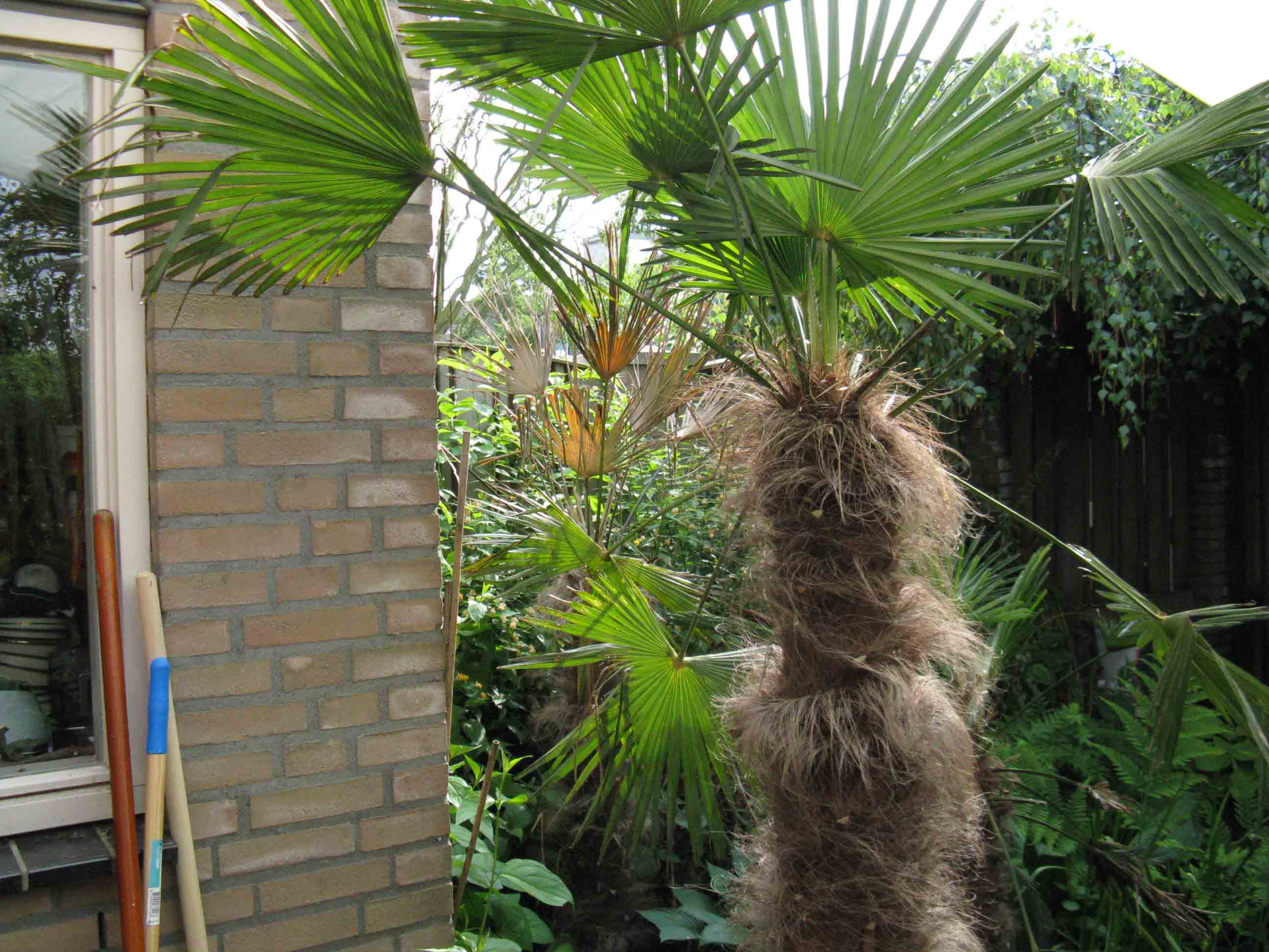 De Trachycarpus wagnerianus staat in de volle grond en er voor staat een kleinere en heeft niets geleden