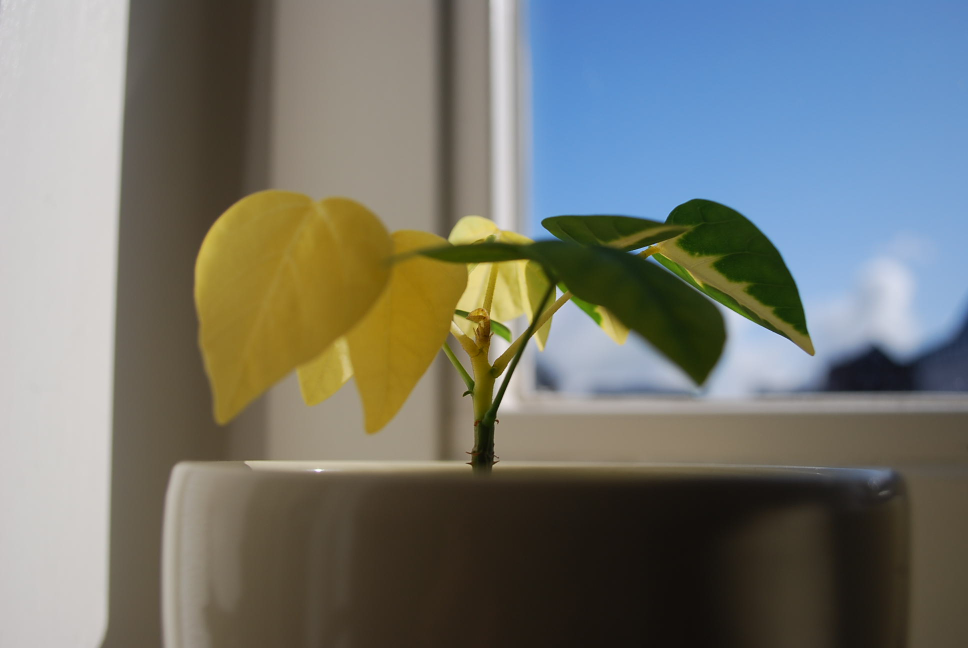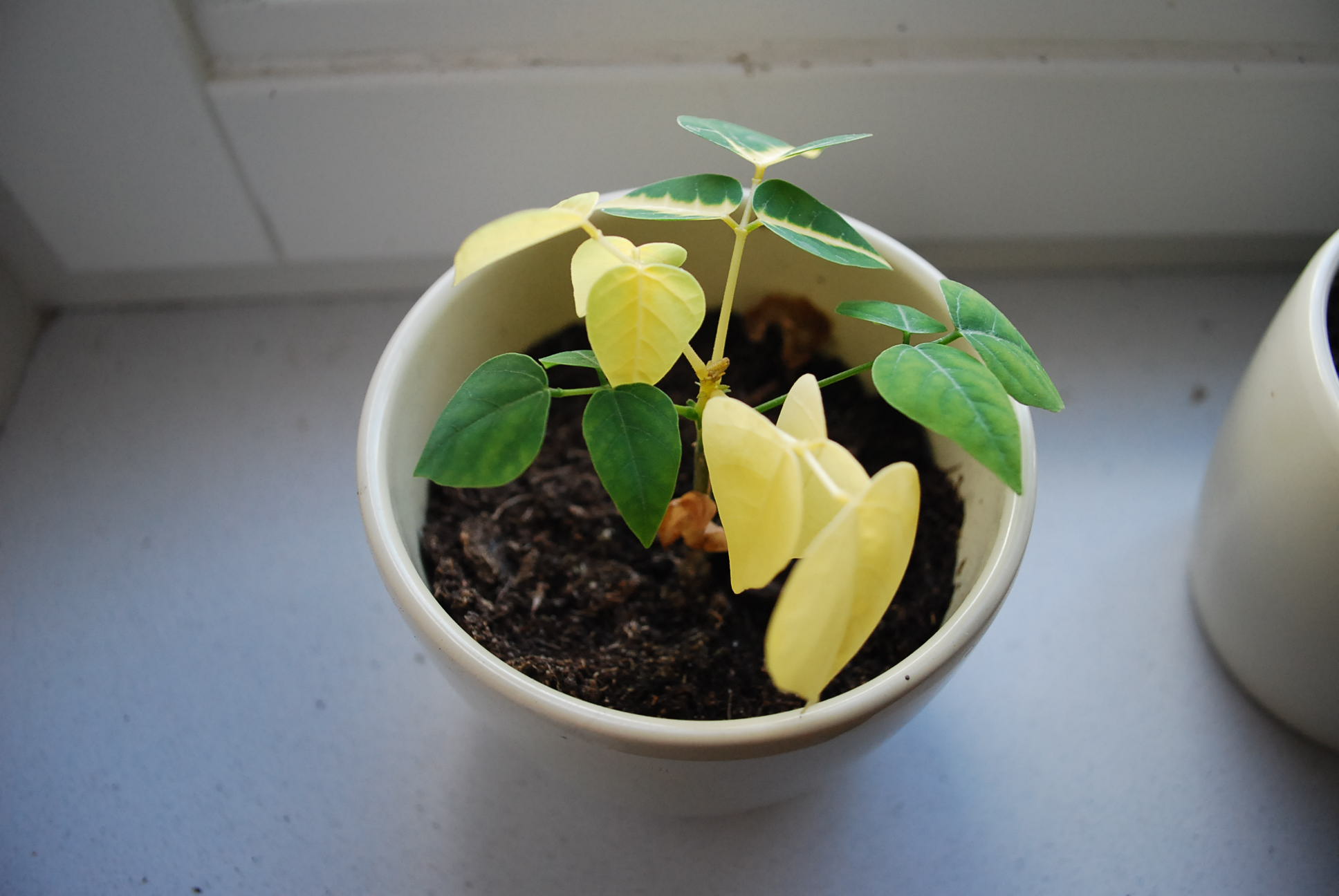 Nu maakt één van die plantjes alleen maar licht gele bladeren aan!? Ik zou niet eens meer weten welke plant dit is, maar ik vind 't wel een leuk boompje (ik weet dat het een boompje wordt). Nu is mijn vraag dus; kan iemand mij vertellen hoe ik 'm weer aan de groene blaadjes krijg!?