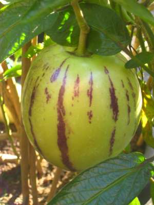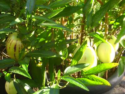 Jammer dat ik het eerste bericht over Meloenpeer heb gemist, ik ben namelijk een groot fan. Ik heb deze plant nu voor het tweede jaar en over een tijdje kan ik weer genieten van deze heerlijke vrucht. Waarom bij jou de bloemen afvallen weet ik helaas niet, ik kan je alleen vertellen hoe ik deze plant verzorg. Hij staat bij mij in een grote pot op een zonnige plaats en ik geef 'm regelmatig 20-20-20 of koemestkorrels. Dat is het enige. Hij geeft genoeg bloemen en vruchten (zie foto, de grootste vrucht gaat meer dan een pond wegen). Misschien heeft jouw plant toch teveel water gehad maar dan zou mijn plant daar ook last van moeten hebben. Kortom, ik kan je niet helpen. Mocht je een nieuwe stek willen hebben, laat het me dan weten.