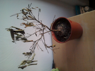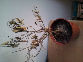 Bijna alle bladeren zijn er nu vanaf, er hangen nog wat ingedroogde minisinaasappeltjes aan en wat verdorde bladeren. Ik heb hem al sinds november geen water meer gegeven, omdat hij te nat zou staan. Kan het misschien dat hij in de lente, als ik hem weer water ga geven wanneer het warmer wordt, weer uitloopt? Hoop het, maar het ziet er uit als een verloren zaak.